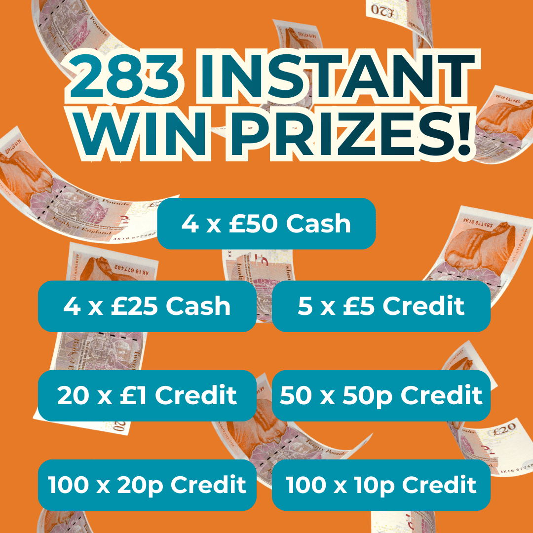 Instant wins include: 4 x £50 Cash. 4 x £25 Cash. 5 x £5 Site Credit. 20 x £1 Site Credit. 50 x 50p Credit. 100 x 20p Credit. 100 x 10p Credit.